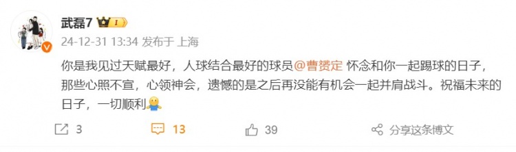 12月31日訊 今天,35歲申花中場球員曹赟定正式退役,國腳武磊發(fā)文送上祝福。
