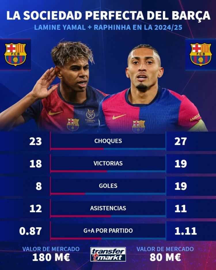 1月14日訊 在西超杯決賽后,德轉曬出了巴薩兩名主力攻擊手亞馬爾和拉菲尼亞的數(shù)據(jù),本賽季,兩人已經(jīng)聯(lián)手制造50粒進球。