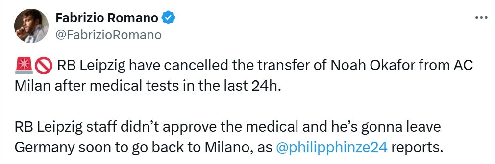 羅馬諾今日發(fā)推:萊比錫取消米蘭前鋒奧卡福的轉(zhuǎn)會,因為球員體檢未過。球員將很快離開德國回到米蘭。