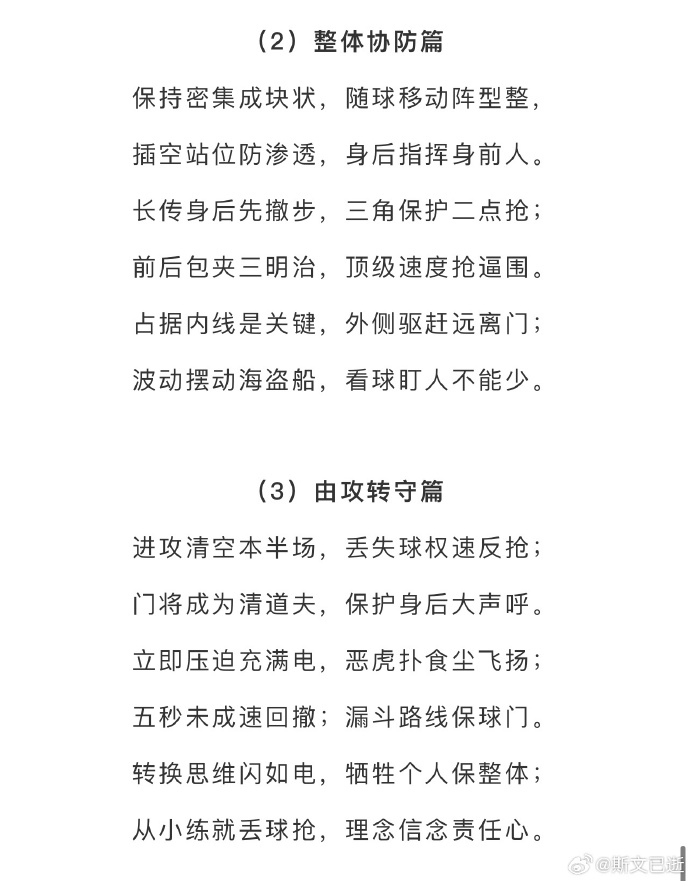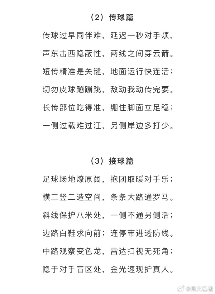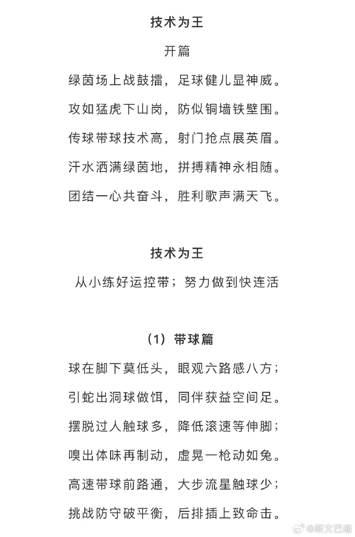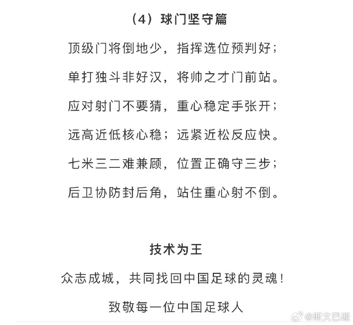 01月14日訊 據(jù)北青體育報(bào)道,前國(guó)腳門(mén)將宗磊的足球教學(xué)文案引發(fā)國(guó)內(nèi)國(guó)內(nèi)足球界朋友圈的關(guān)注,還獲得了中國(guó)足協(xié)主席宋凱的點(diǎn)贊,這份文案以“技術(shù)為王”為主題,全文共8篇,每篇12句話,每句話7個(gè)字,共672字,呈現(xiàn)出足球的發(fā)展理念、比賽攻防原則、技術(shù)融入戰(zhàn)術(shù)等指導(dǎo)關(guān)鍵點(diǎn),文字精煉,還接地氣。