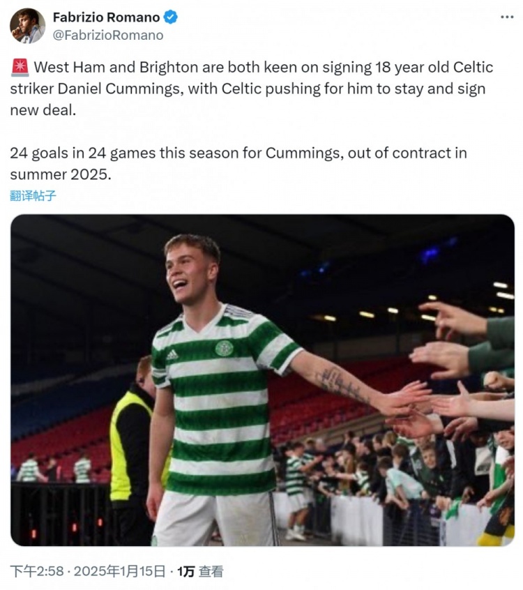羅馬諾指出,西漢姆、布萊頓對(duì)丹尼爾-卡明斯感興趣,有意簽下這位18歲的鋒線小將,而凱爾特人正在推動(dòng)球員留隊(duì),并簽署續(xù)約合同。