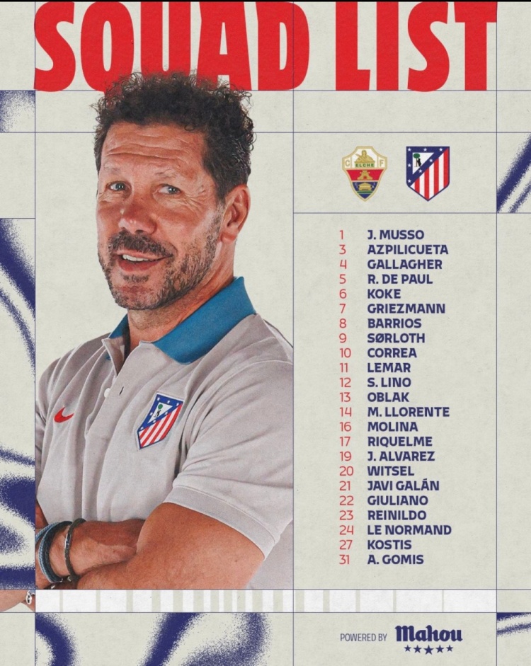 1月15日訊 馬競將在國王杯1/8決賽面對埃爾切,球隊官方也公布了本場比賽大名單,阿爾瓦雷斯、格列茲曼在列,以下為具體名單: