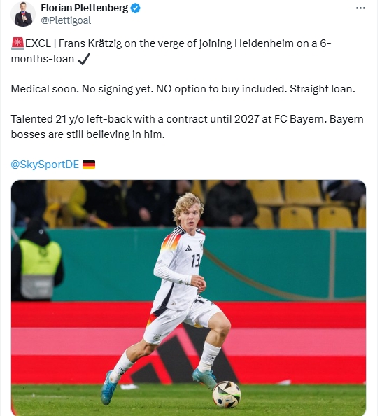Florian Plettenberg在社交媒體上這樣寫道:“獨(dú)家:克雷齊希即將以6個(gè)月租借的形式加盟海登海姆,體檢很快進(jìn)行,目前各方尚未簽約,租借不包括購(gòu)買選項(xiàng)?!?/p>