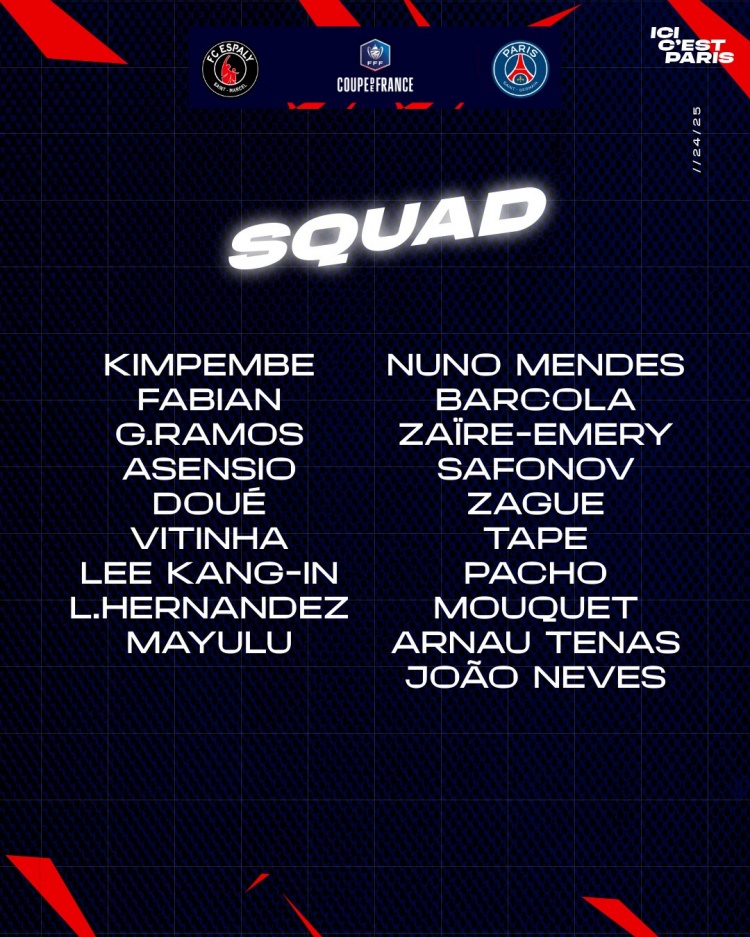 金彭貝回歸,登貝萊、阿什拉夫、多納魯馬、馬爾基尼奧斯、什克里尼亞爾、貝拉爾多、姆巴耶缺席。根據(jù)媒體的報(bào)道,穆阿尼將租借加盟尤文,他沒有入選此役名單。
