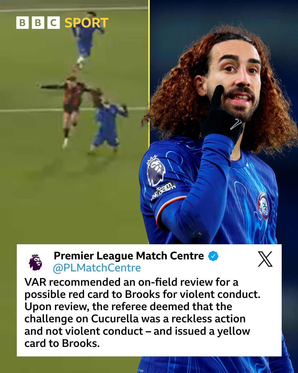 英超官方解釋稱:“VAR建議現(xiàn)場復(fù)查布魯克斯犯規(guī)潛在的紅牌事件。主裁判審查后,認(rèn)為他對庫庫雷利亞的犯規(guī)是魯莽行為而非暴力行為,并向布魯克斯出示黃牌。”