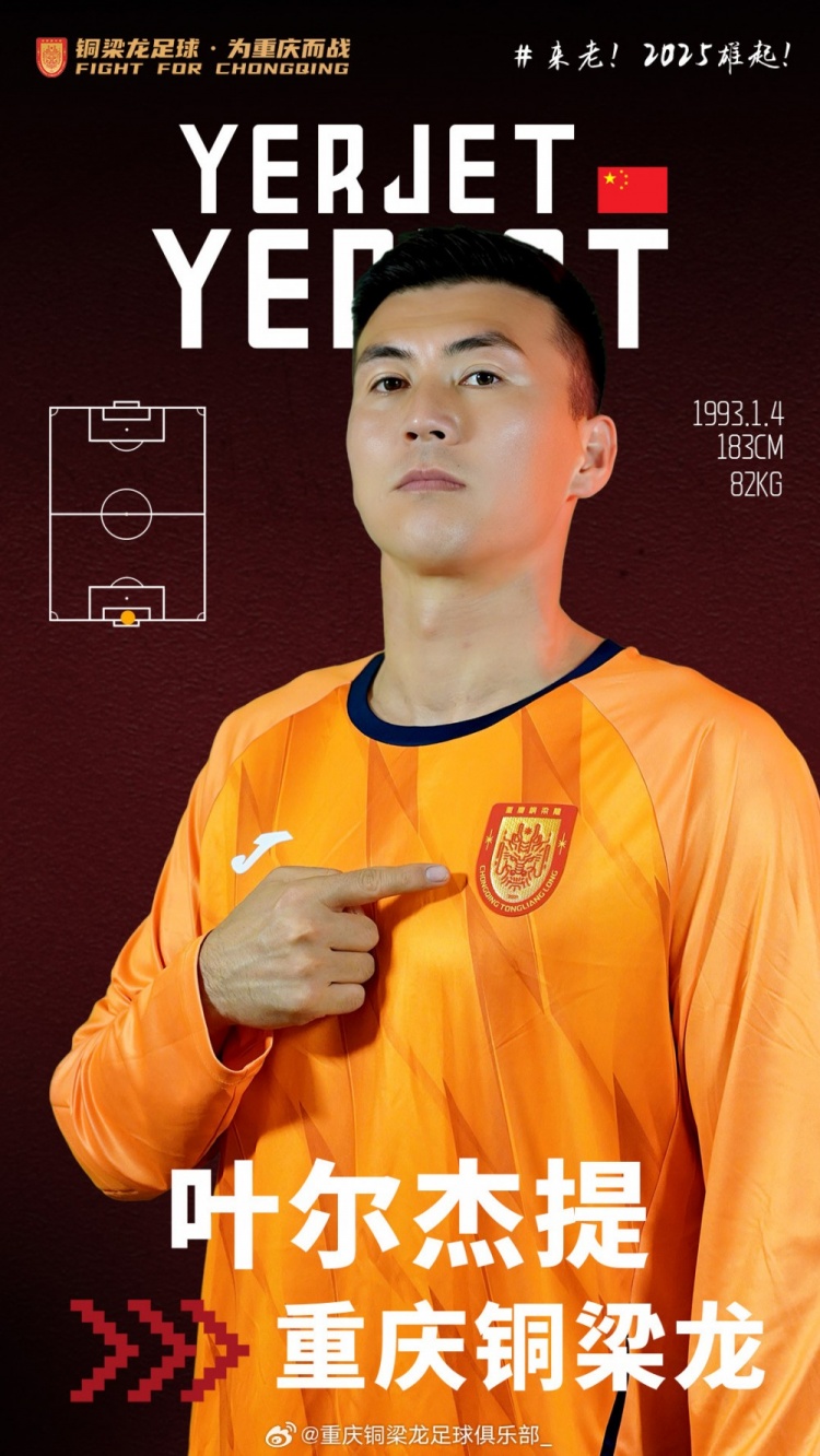 1月15日訊 重慶銅梁龍俱樂部官方宣布,門將葉爾杰提加盟球隊。
