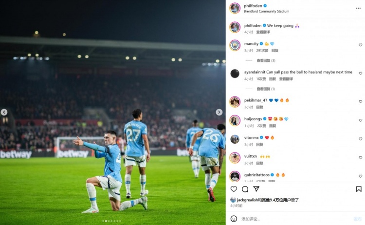 福登在個(gè)人社媒曬出本場(chǎng)進(jìn)球后標(biāo)志性慶祝動(dòng)作,配文寫(xiě)道:“我們還要繼續(xù)前進(jìn)!”