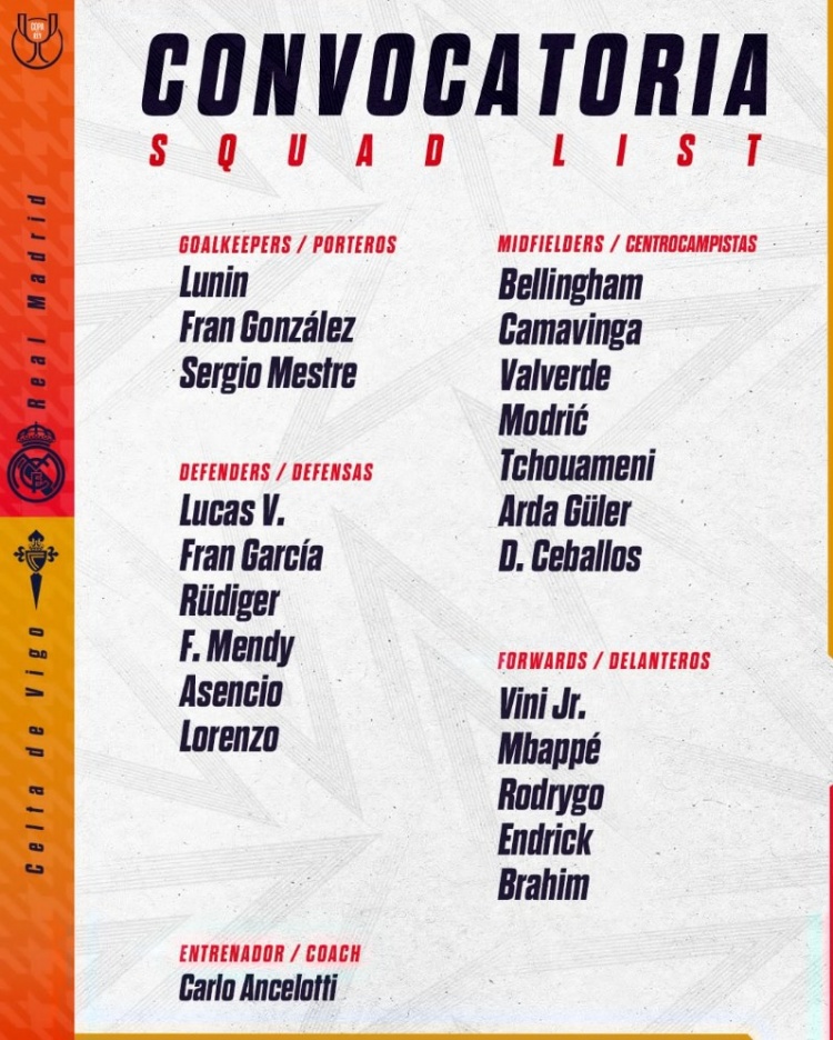 1月15日訊 北京時間1月17日凌晨4:30,西班牙國王杯1/8決賽,皇馬將坐鎮(zhèn)伯納烏球場迎戰(zhàn)塞爾塔。賽前,皇馬官方公布了本場比賽球隊大名單,庫爾圖瓦缺席,姆巴佩&維尼修斯領銜鋒線。