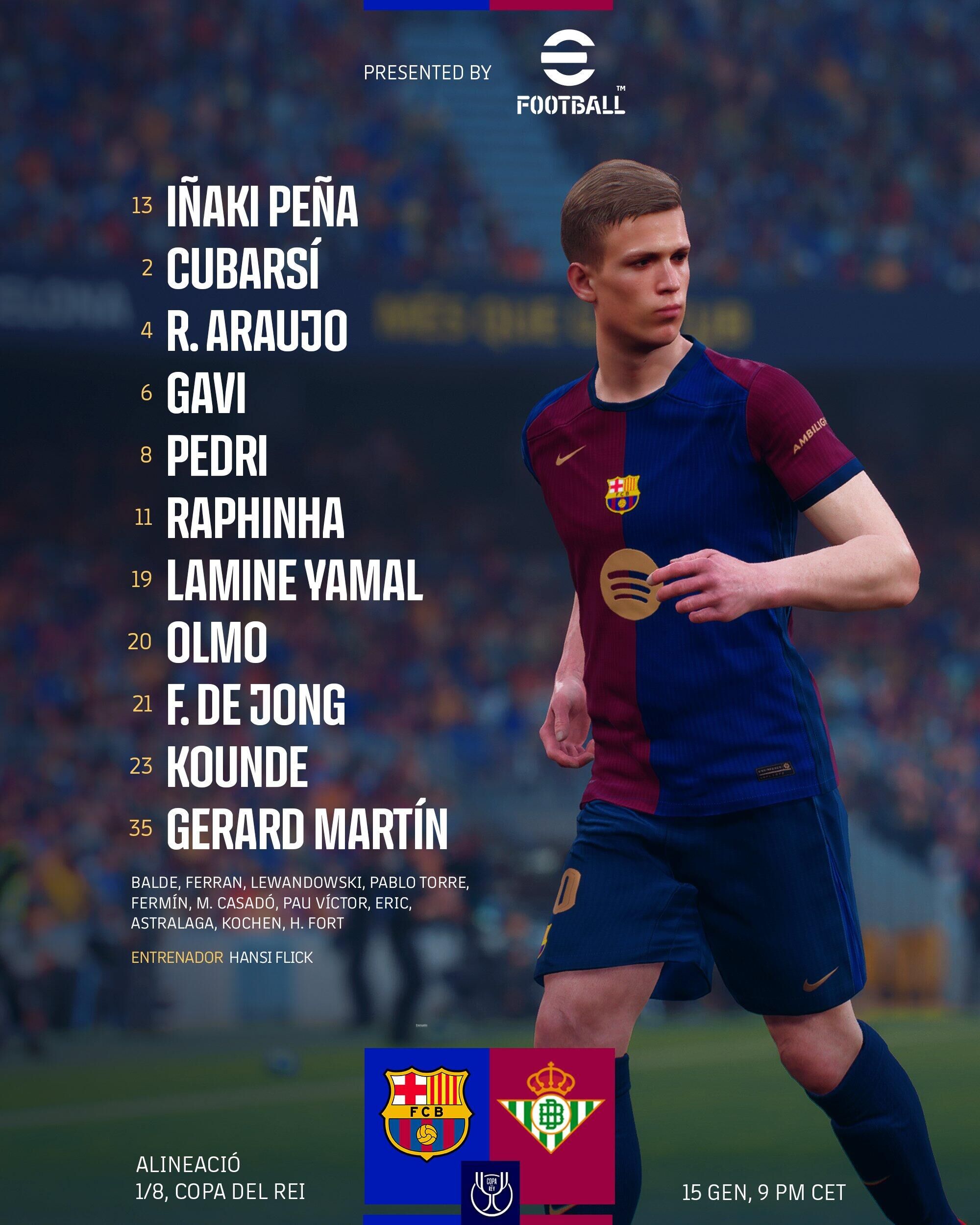 1月16日訊 國(guó)王杯1/8決賽,巴薩主場(chǎng)對(duì)陣貝蒂斯。賽前,官方公布了本場(chǎng)的首發(fā)名單。