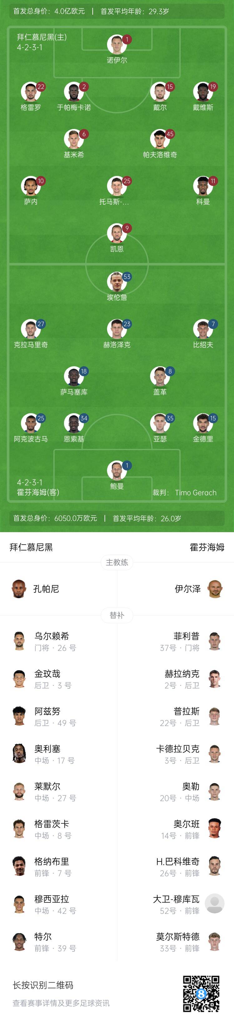 1月16日訊 德甲第17輪,拜仁主場對陣霍芬海姆。賽前,官方公布了本場的首發(fā)名單。