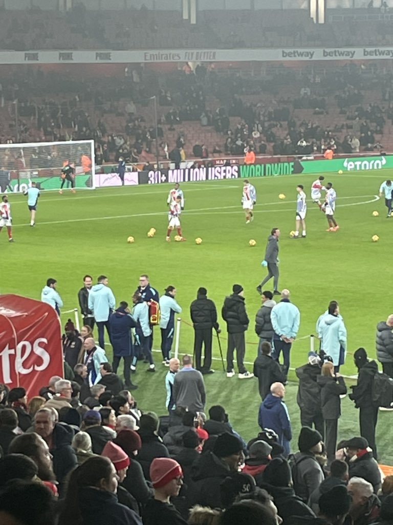 賽前熱身階段,薩卡被拍到在場邊拄拐觀看球隊(duì)熱身。