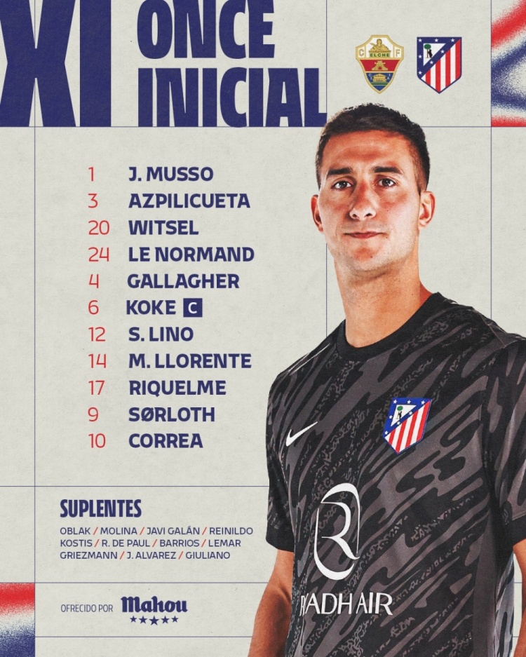 馬競首發(fā):穆索、阿斯皮利奎塔、維特塞爾、勒諾爾芒、加拉格爾、科克、利諾、略倫特、里克爾梅、索爾洛特、科雷亞