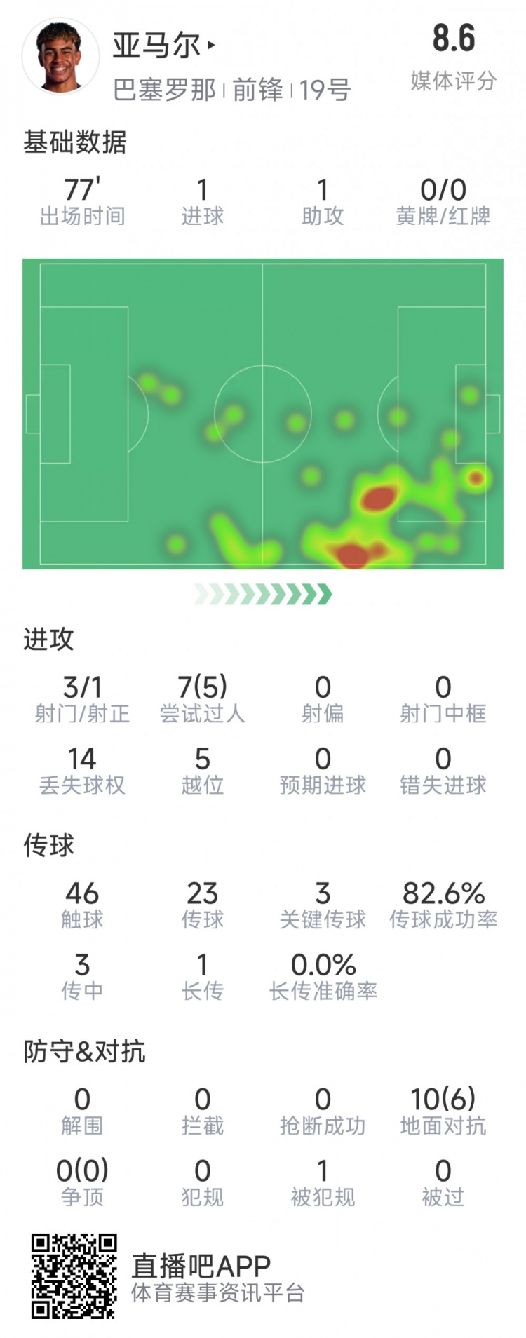1月16日訊 在本輪國王杯巴薩對陣貝蒂斯的比賽中,亞馬爾傳射建功,以下為他在本場具體數(shù)據(jù):