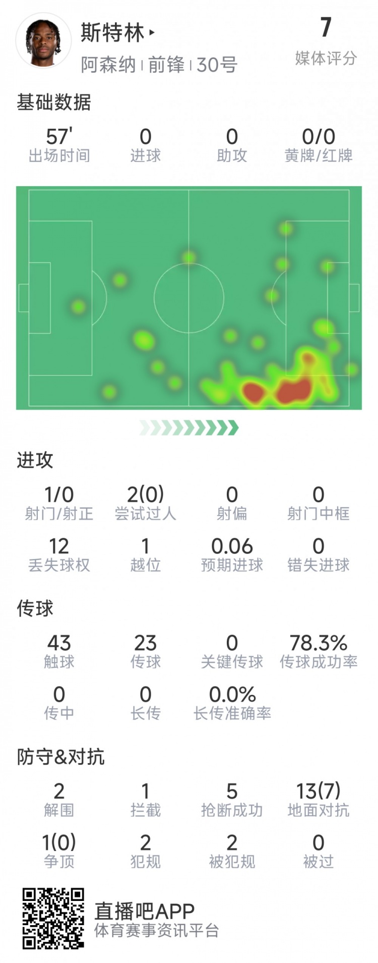 1月16日訊 在本輪英超阿森納對陣熱刺的比賽中,斯特林首發(fā)登場,以下為他在本場數(shù)據(jù):