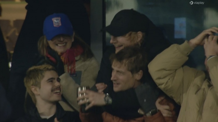 來到現(xiàn)場觀戰(zhàn)本場比賽的伊普斯維奇小股東、歌手黃老板(艾德-希蘭)也是心情大好,賽后喜笑顏開并與友人慶祝勝利。