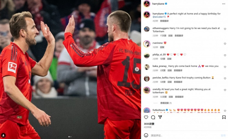 本場比賽凱恩傳射建功,賽后他在個人社媒曬出與戴爾的合影為隊(duì)友送上生日祝福,配文寫道:“主場的完美之夜,祝戴爾生日快樂!”