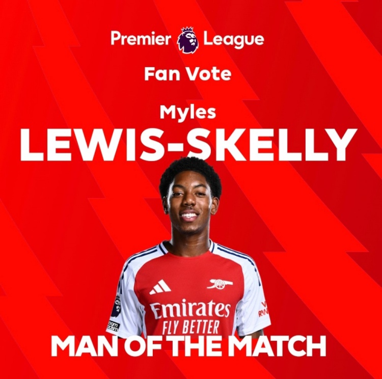 本場比賽阿森納小將斯凱利發(fā)揮出色,賽后他也以43.7%的得票率當(dāng)選英超官方球迷票選本場最佳球員。