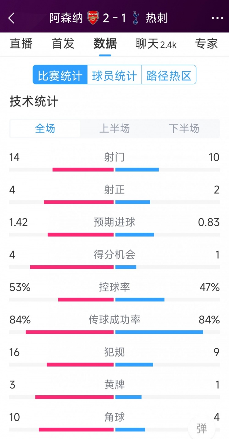 1月16日訊 在本輪英超,阿森納2-1擊敗熱刺,以下為雙方全場(chǎng)數(shù)據(jù)對(duì)比: