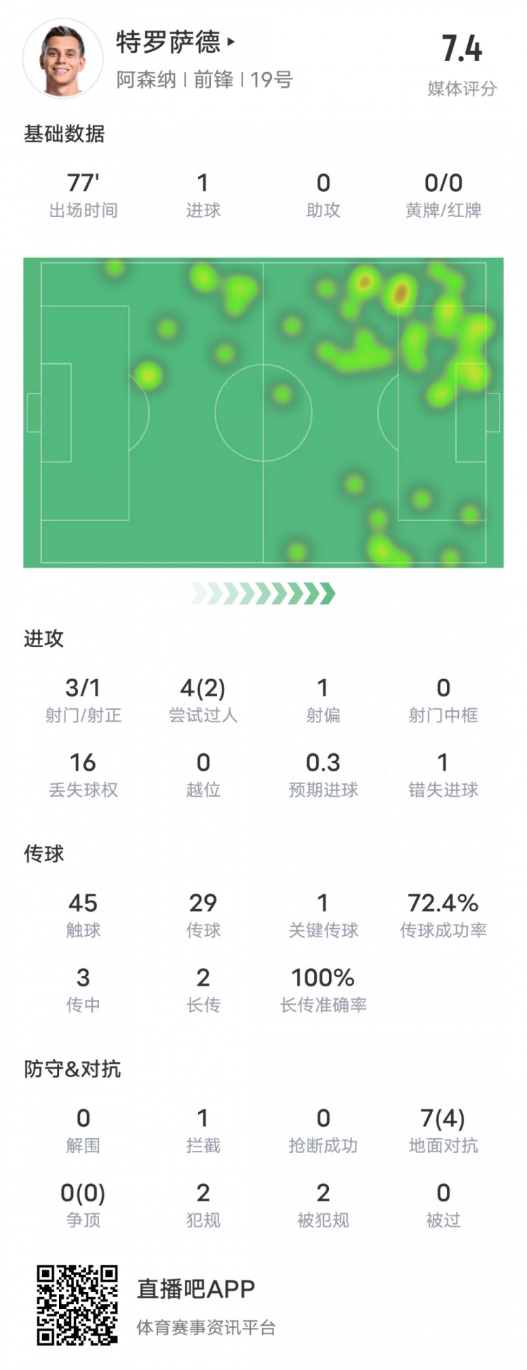 1月16日訊 英超第21輪,阿森納對陣熱刺,特羅薩德首發(fā)出戰(zhàn),貢獻1粒進球,送出1次關(guān)鍵傳球,但也有1次錯失進球機會,評分7.4。