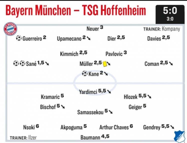 1月16日訊 在本輪德甲,拜仁5-0大勝霍芬海姆,《踢球者》也為拜仁球員本場表現(xiàn)做出評分,其中本場薩內(nèi)梅開二度、凱恩傳射建功,均獲得高分,以下為具體情況(德媒評分1分最高,6分最低):