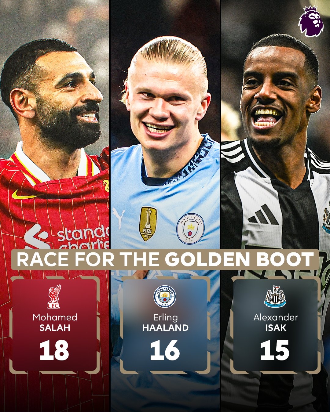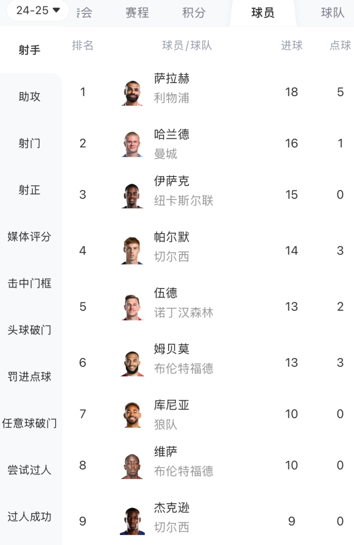 英超的射手榜前列也競(jìng)爭(zhēng)很激烈,目前薩拉赫18球領(lǐng)跑,哈蘭德16球第二,伊薩克15球第三。