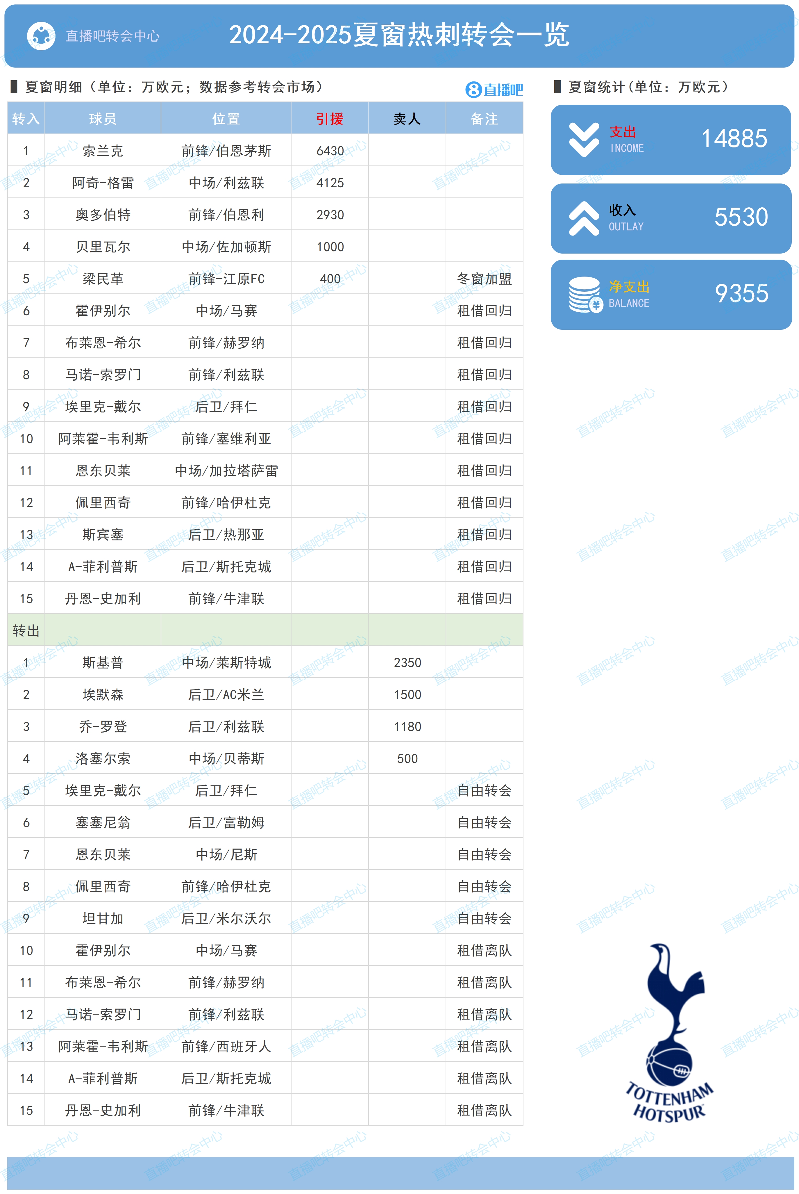 去年夏窗,熱刺共花費(fèi)1.48億歐引進(jìn)索蘭克、格雷、奧多伯特、貝里瓦爾、梁民革等新援,但本賽季成績(jī)不佳,目前距離前四還有14分之差。