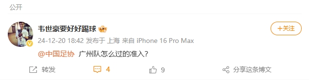 足協(xié)2024年12月20日公布第二批完成債務(wù)清償俱樂(lè)部名單僅僅幾分鐘后,韋世豪就在個(gè)人微博發(fā)文,并@中國(guó)足協(xié):“廣州隊(duì)怎么過(guò)的準(zhǔn)入?”