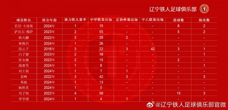 1月16日訊 遼寧鐵人俱樂部官方宣布,若昂-卡洛斯、薩比爾-穆薩、韓天麟、林隆昌、段云子、白子健、雷永馳、戰(zhàn)賽男、劉士銘、姜峰、鄧彪、楊勝茗這12名球員離隊(duì)。