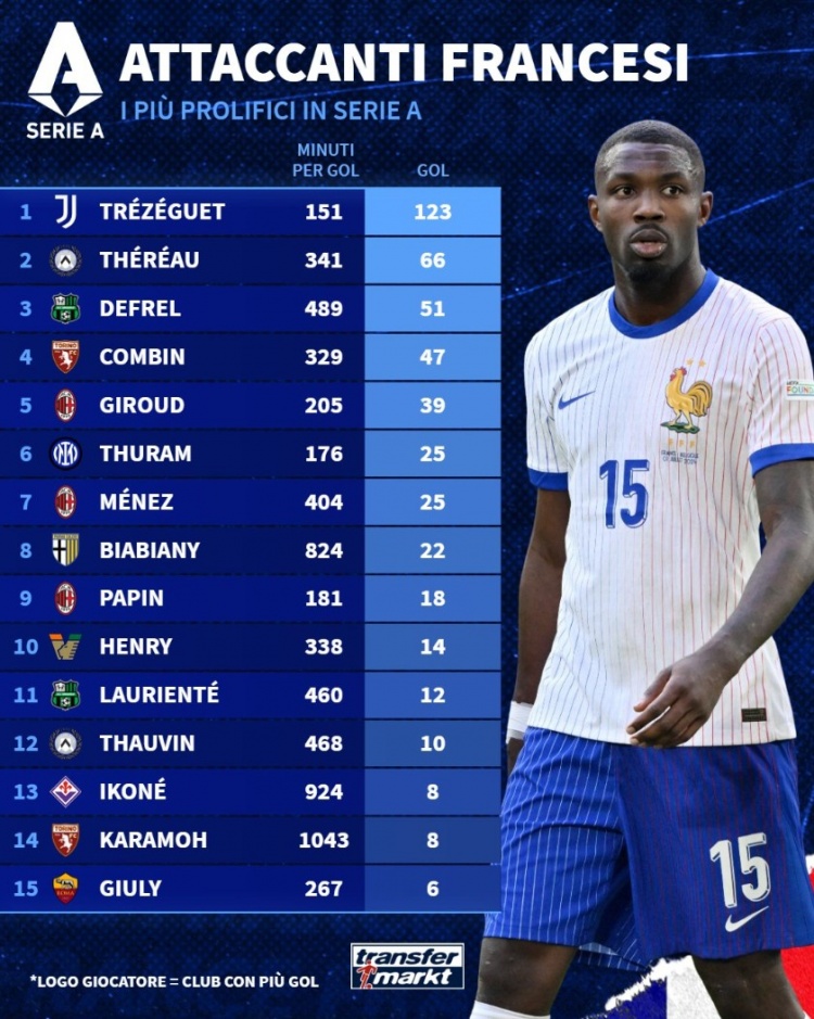 1月16日訊 德國轉(zhuǎn)會市場網(wǎng)統(tǒng)計(jì)了法國前鋒在意甲聯(lián)賽的進(jìn)球數(shù)排行,尤文名宿特雷澤蓋123球第一,吉魯39球第五。