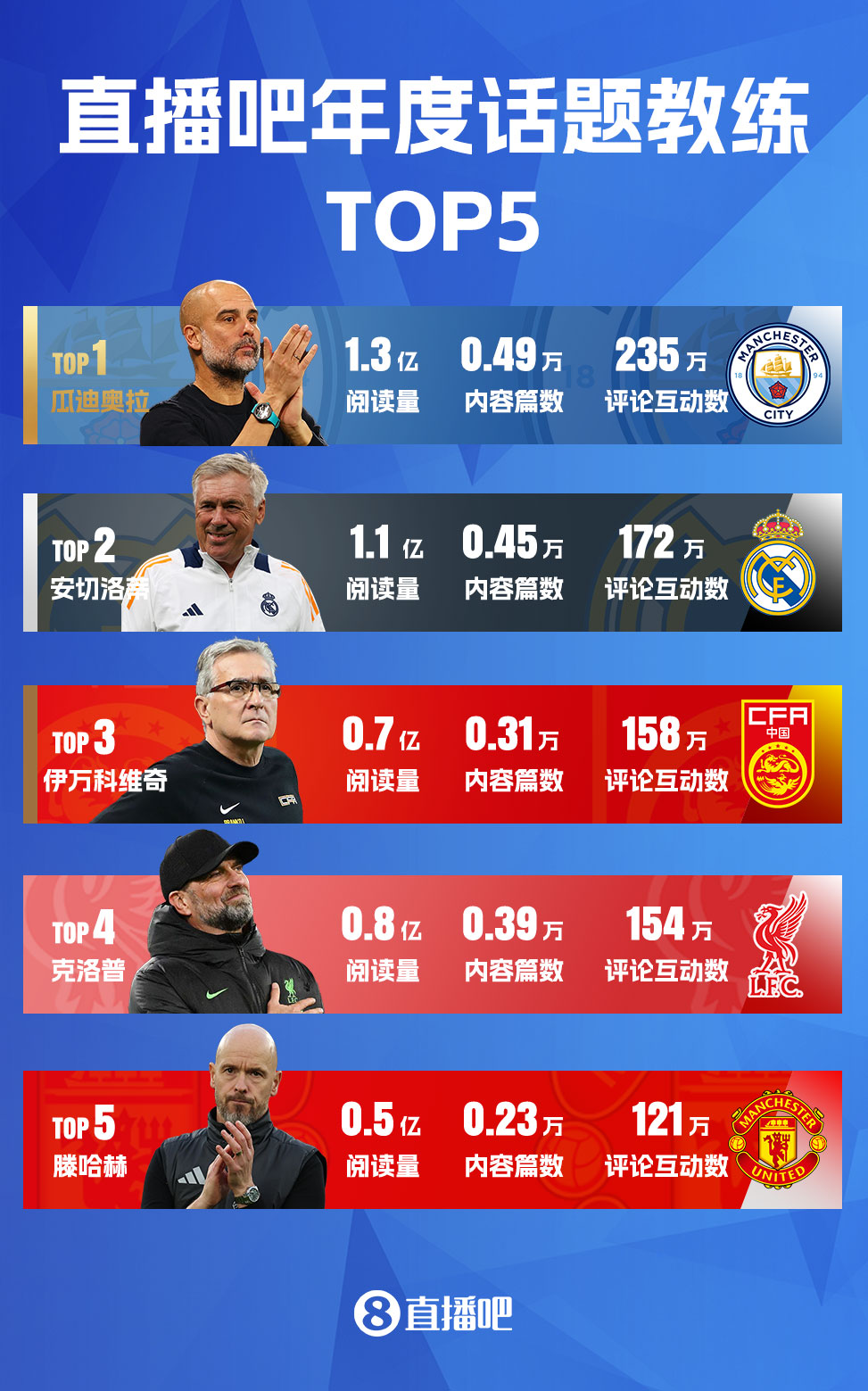 - 直播吧2024年度五大話題教練:瓜迪奧拉領(lǐng)銜,伊萬(wàn)、滕哈赫在列
