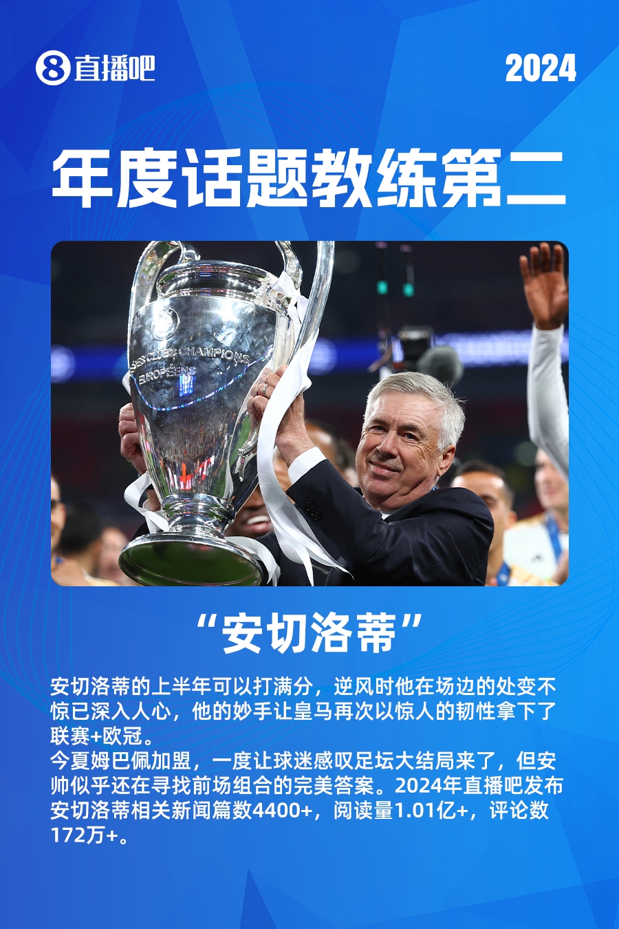 今夏姆巴佩加盟,一度讓球迷感嘆足壇大結(jié)局來(lái)了,但安帥似乎還在尋找前場(chǎng)組合的完美答案。2024年發(fā)布安切洛蒂相關(guān)新聞篇數(shù)4400+,閱讀量1.01億+,評(píng)論數(shù)172萬(wàn)+。