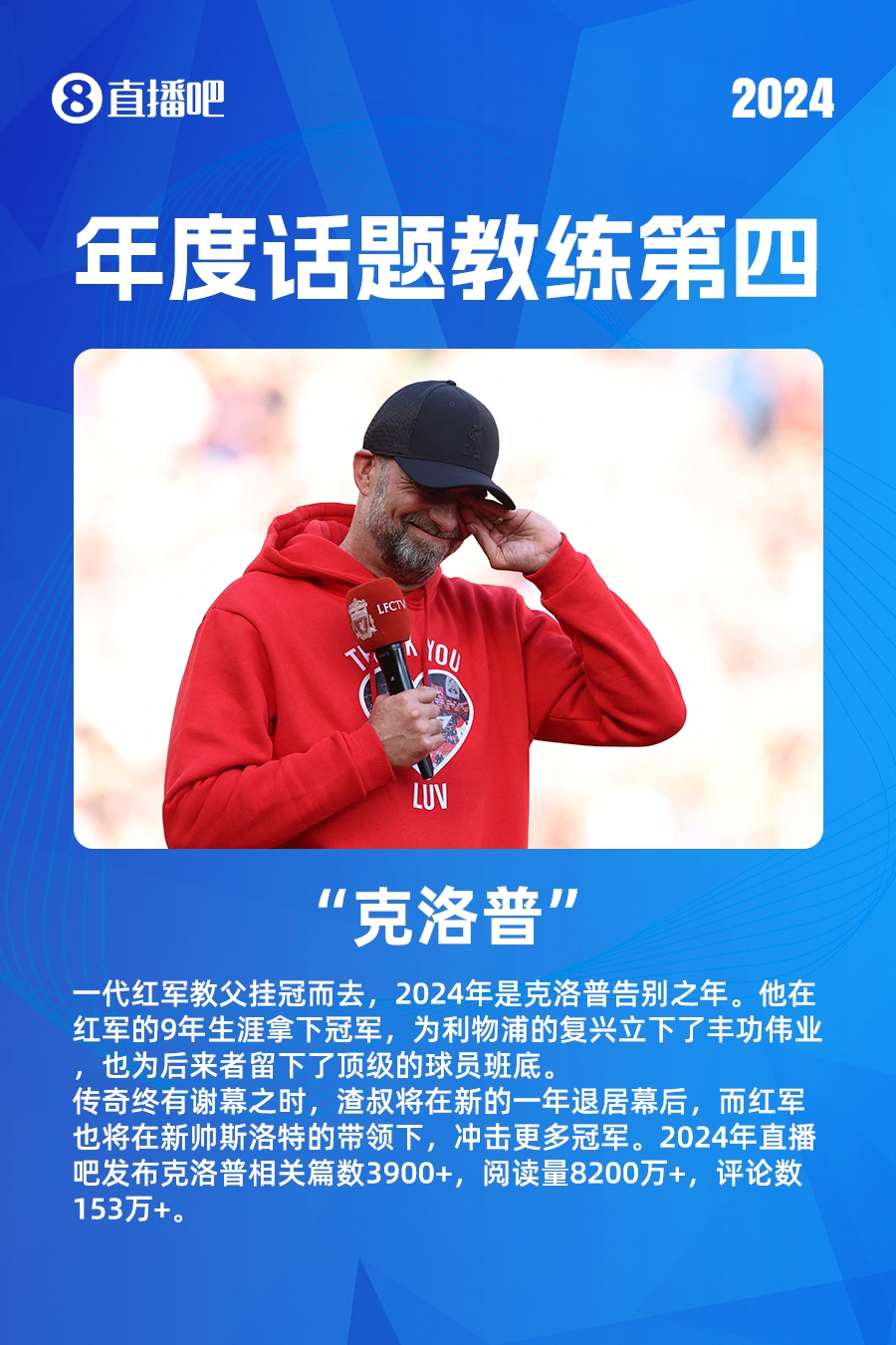 傳奇終有謝幕之時(shí),渣叔將在新的一年退居幕后,而紅軍也將在新帥斯洛特的帶領(lǐng)下,沖擊更多冠軍。2024年發(fā)布克洛普相關(guān)篇數(shù)3900+,閱讀量8200萬(wàn)+,評(píng)論數(shù)153萬(wàn)+。