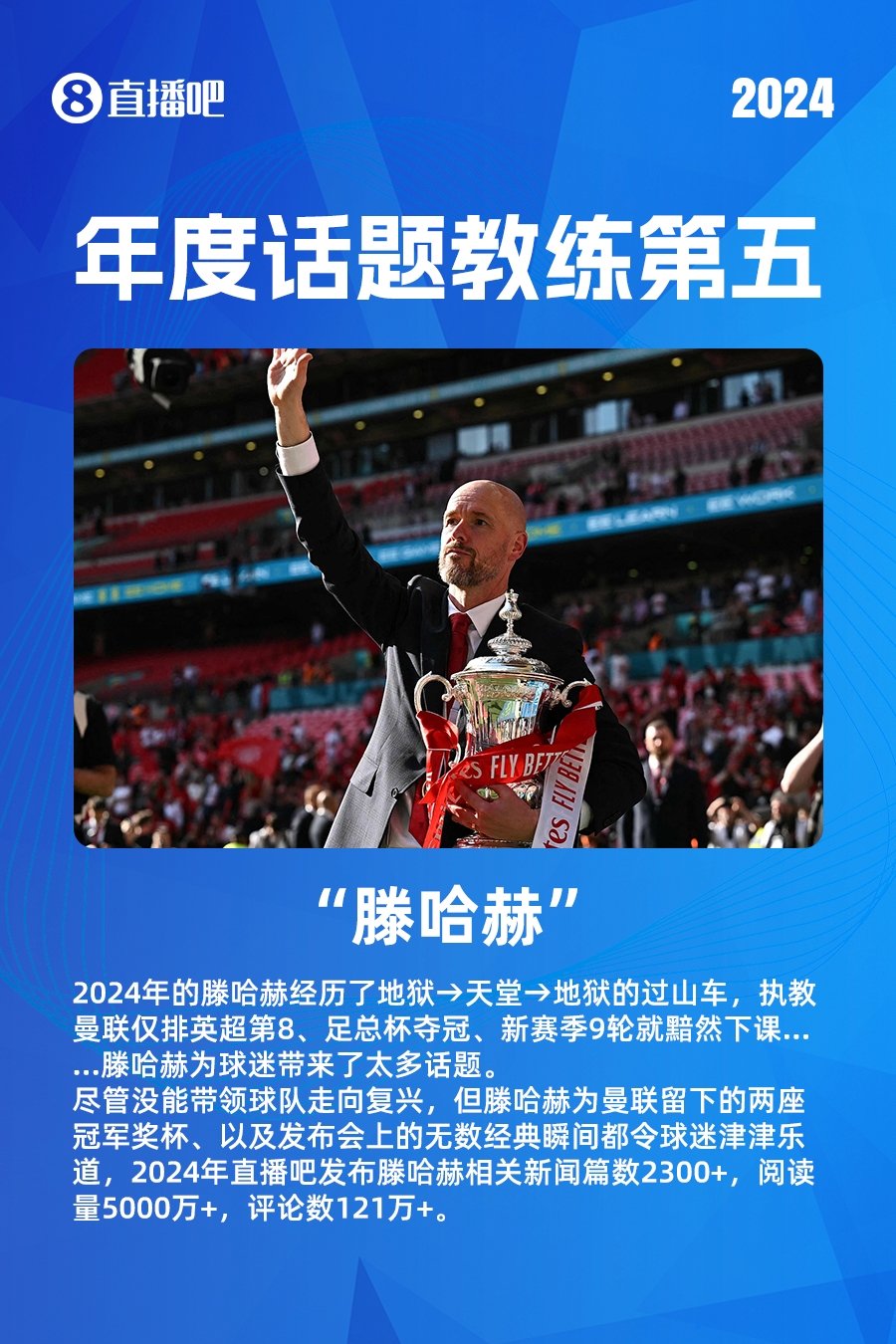 盡管沒能帶領(lǐng)球隊(duì)走向復(fù)興,但滕哈赫為曼聯(lián)留下的兩座冠軍獎(jiǎng)杯、以及發(fā)布會(huì)上的無(wú)數(shù)經(jīng)典瞬間都令球迷津津樂(lè)道,2024年發(fā)布滕哈赫相關(guān)新聞2300+,閱讀量5000萬(wàn)+,評(píng)論數(shù)121萬(wàn)+。
