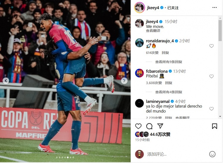 除特別注明外,本站所有內(nèi)容均為九球直播整理排版,轉(zhuǎn)載請(qǐng)注明出處:孔德社媒曬圖,亞馬爾評(píng)論:早就說了,世界最佳右后衛(wèi)!