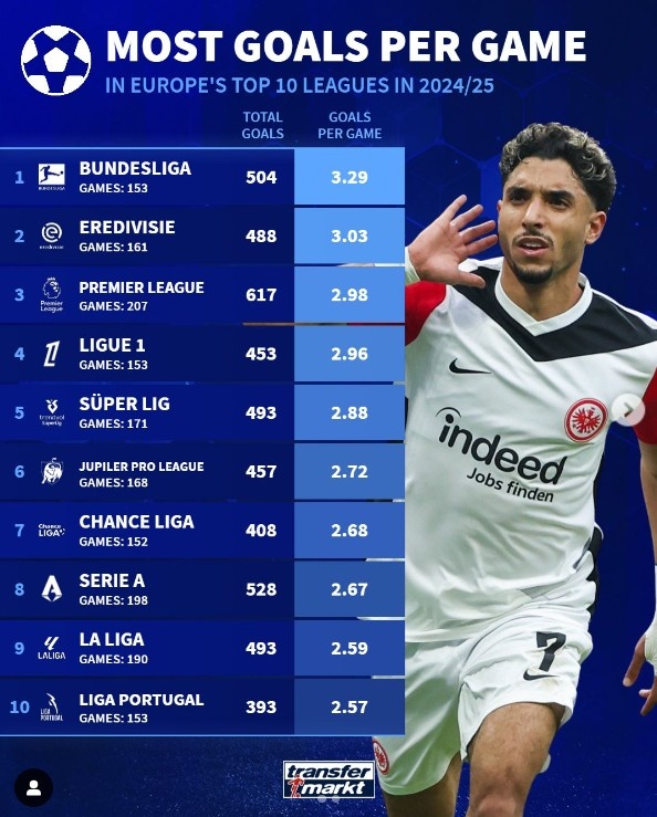 歐洲主流10大聯(lián)賽場(chǎng)均進(jìn)球排行:德甲3.29球居首,英超2.98球第三