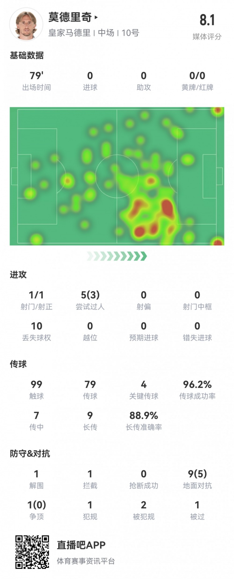 發(fā)布時間:2025年01月17日 06:50點擊:欄目:足球新聞 1月17日訊 正在進行的國王杯,皇馬2-1領(lǐng)先塞爾塔。此役莫德里奇首發(fā)79分鐘被換下,球員全場重點數(shù)據(jù)如下↓1射1正5次過人成功3次10次丟失球權(quán)99次觸球傳球成功率96.2%4次關(guān)鍵傳球1次解圍1次攔截10次對抗成功5次9次長傳成功8次評分8.1 除特別注明外,本站所有內(nèi)容均為九球直播整理排版,轉(zhuǎn)載請注明出處:魔笛數(shù)據(jù):3次成功過人,4次關(guān)鍵傳球,傳球成功率96.2%,評分8.1 本文標簽: 足球 西甲 皇家馬德里 莫德里奇
