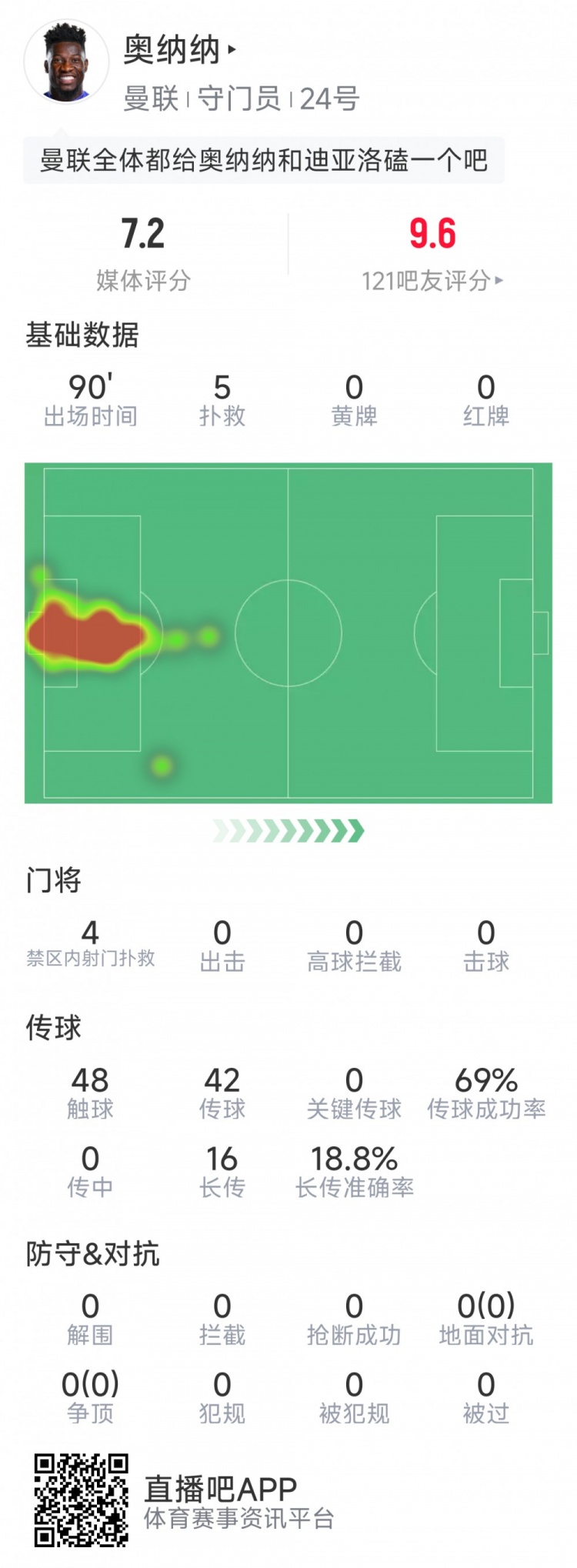 本場比賽曼聯(lián)門將奧納納發(fā)揮不俗,全場貢獻5次撲救,48次觸球 ,傳球成功率69%,sofa評分7.2分。