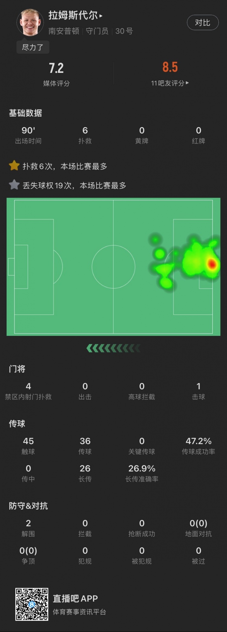 1月17日訊 剛剛結(jié)束的英超比賽中,南安普頓1-3遭曼聯(lián)逆轉(zhuǎn)絕殺。本場(chǎng)比賽,拉姆斯代爾發(fā)揮出色,貢獻(xiàn)6次撲救和2次解圍,獲得了SofaScore7.2分的評(píng)分。
