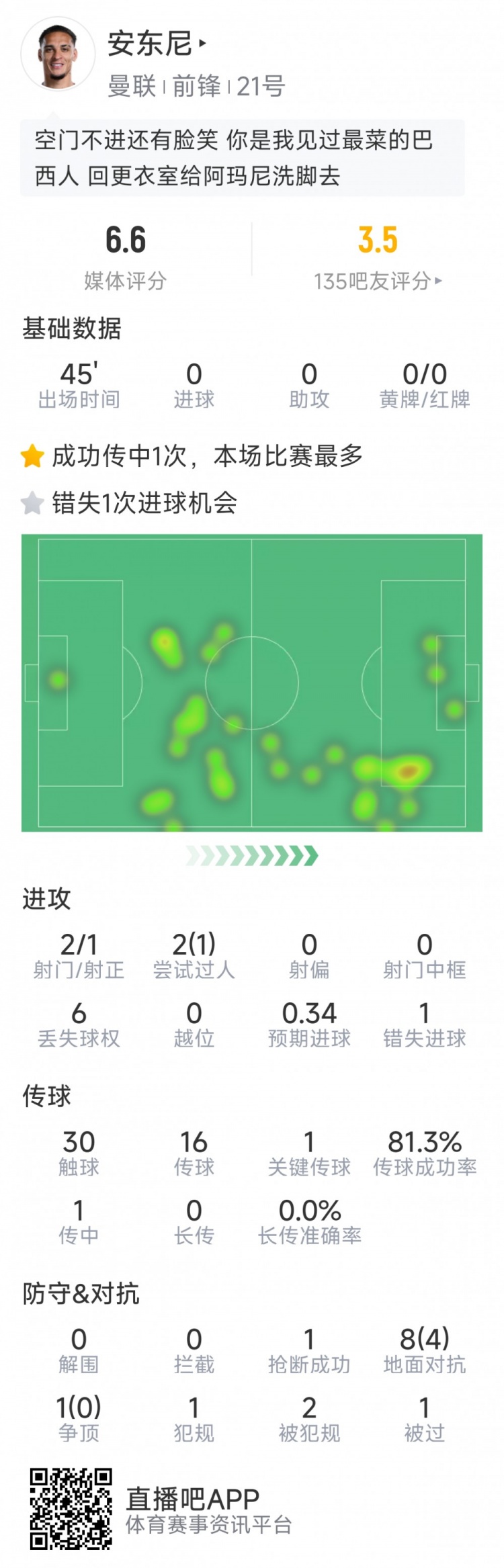 1月17日訊 在本輪英超,曼聯(lián)3-1擊敗南安普頓,安東尼替補(bǔ)登場(chǎng)錯(cuò)失良機(jī),以下為他在本場(chǎng)數(shù)據(jù):