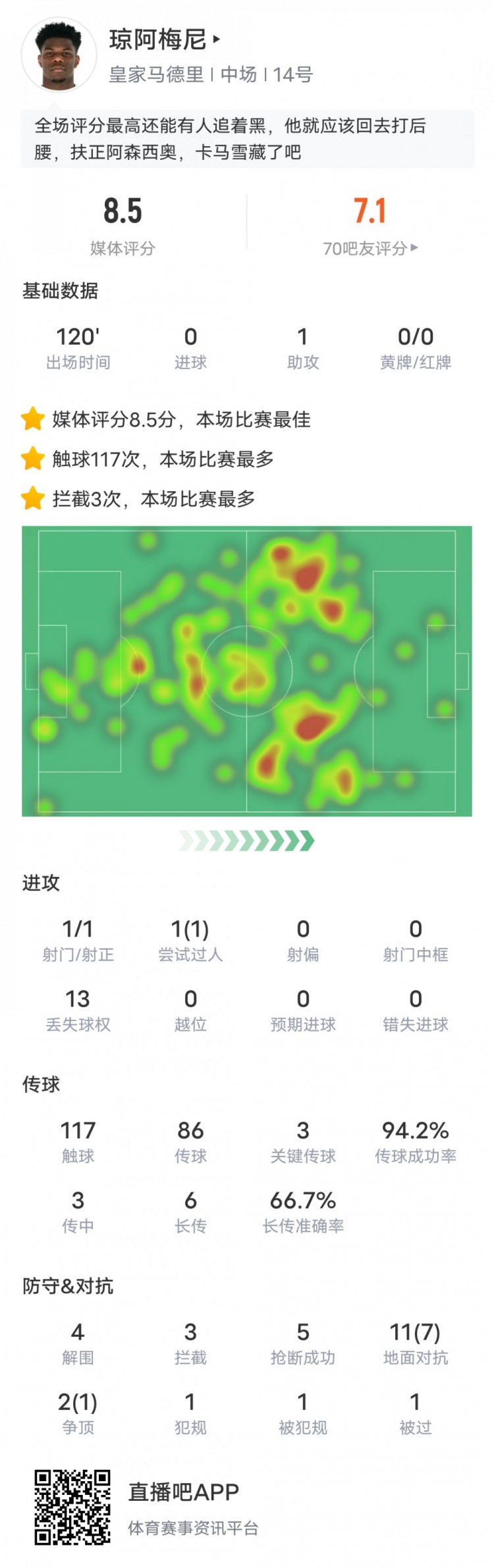 1月17日訊 西班牙國王杯1/8決賽,皇馬加時5-2戰(zhàn)勝塞爾塔。瓊阿梅尼本場比賽首發(fā)出戰(zhàn),打滿全場,送出1次助攻,3次關(guān)鍵傳球,還有4次解圍,3次攔截,5次搶斷,傳球成功率94.2%,評分8.5全場最高。