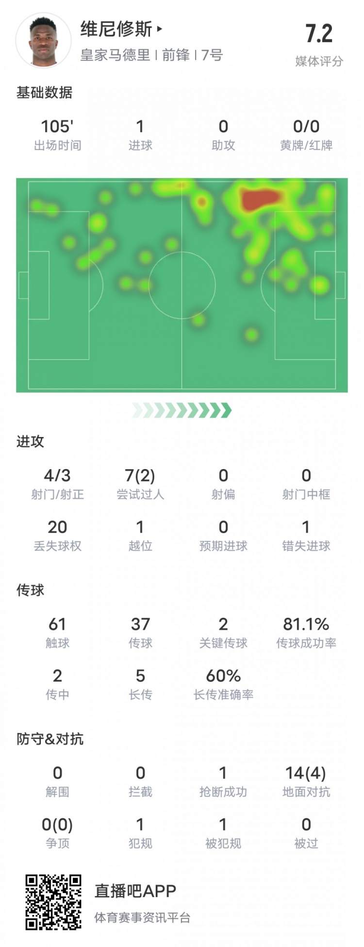 維尼修斯本場(chǎng)比賽數(shù)據(jù):