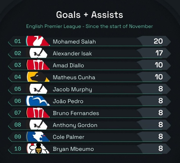 發(fā)布時間:2025年01月17日 07:50點(diǎn)擊:欄目:足球新聞 1月17日訊 在本輪英超曼聯(lián)3-1擊敗南安普頓比賽中,阿瑪?shù)律涎菝弊討蚍āR韵聻樽?1月以來英超參與進(jìn)球榜(進(jìn)球+助攻),具體如下:1、薩拉赫 20球2、伊薩克 17球3、阿瑪?shù)?10球=庫尼亞 10球5、墨菲、若昂-佩德羅、B費(fèi)、戈登、帕爾默、姆貝莫 8球 除特別注明外,本站所有內(nèi)容均為九球直播整理排版,轉(zhuǎn)載請注明出處:自11月英超參與進(jìn)球榜:薩拉赫20球居首,伊薩克次席,阿瑪?shù)碌谌?/a> 本文標(biāo)簽: 足球 英超 曼聯(lián) 切爾西 利物浦