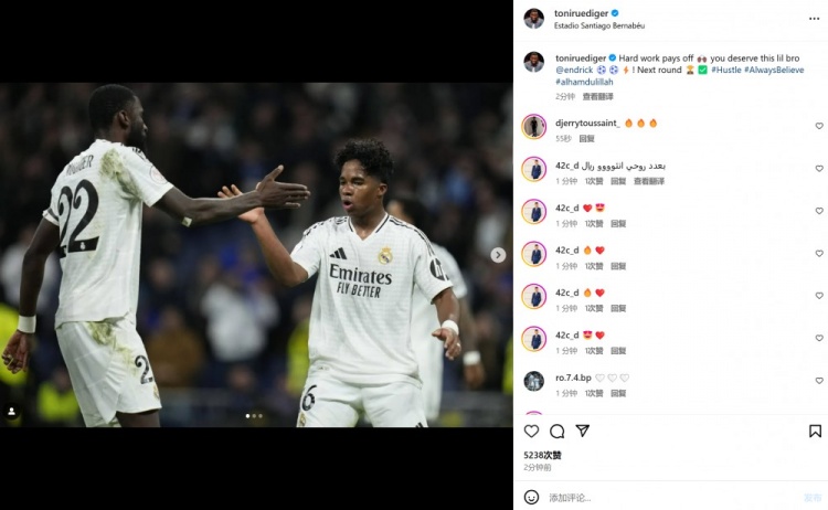 呂迪格賽后也在個(gè)人社媒曬出與恩德里克合影,配文寫道:“努力得到了回報(bào)!你配得上這一切,我的兄弟恩德里克。晉級(jí)下一輪!”