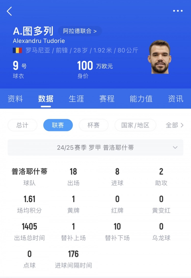 圖多列現(xiàn)年28歲,來自于羅馬尼亞,是一位身高1.92米的中鋒,他本賽季為普羅耶什蒂出戰(zhàn)18場(chǎng)聯(lián)賽打進(jìn)8球,是隊(duì)內(nèi)進(jìn)球最多的球員,這位球員身價(jià)為100萬歐。