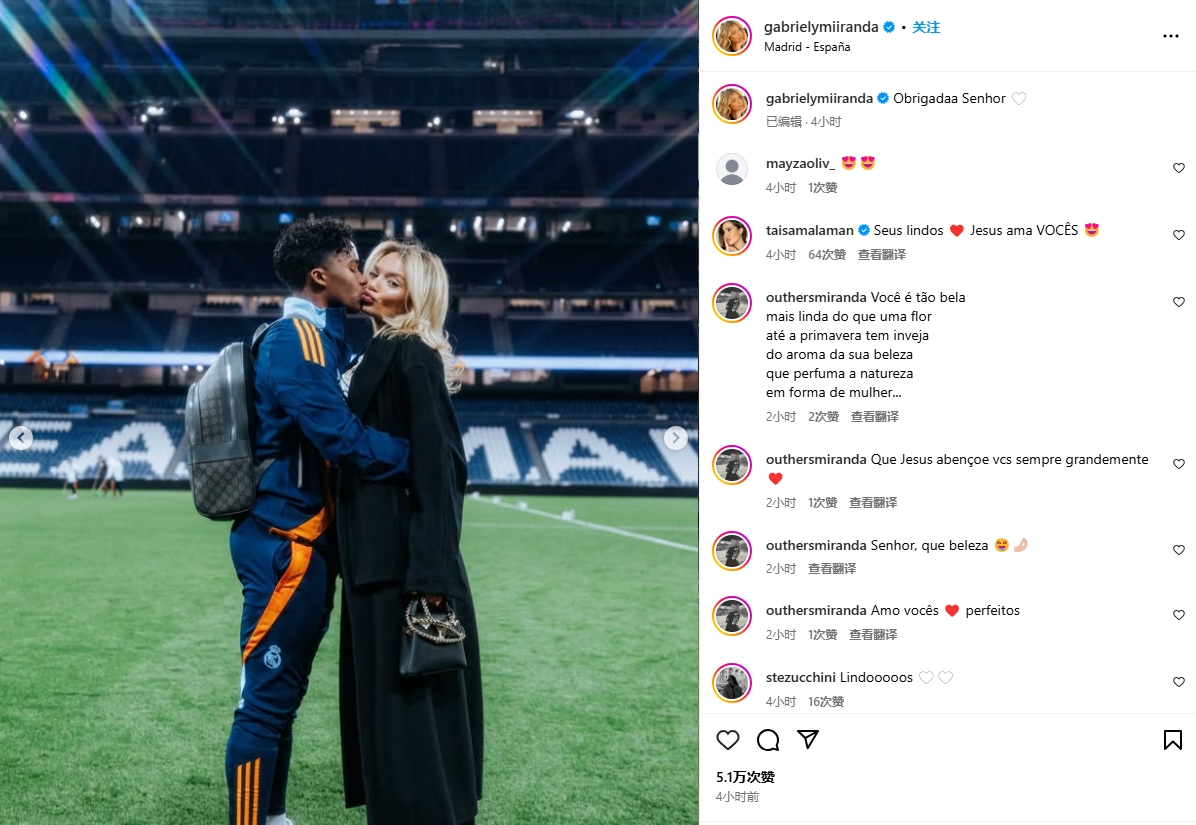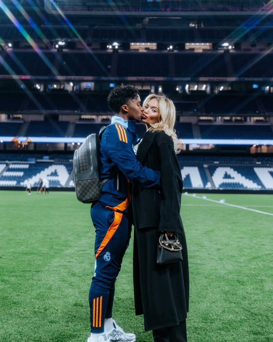 本場(chǎng)比賽18歲恩德里克加時(shí)梅開二度,恩德里克妻子來到現(xiàn)場(chǎng)觀戰(zhàn)。賽后恩德里克妻子米蘭達(dá)曬照與恩德里克在伯納烏球場(chǎng)甜蜜親吻。