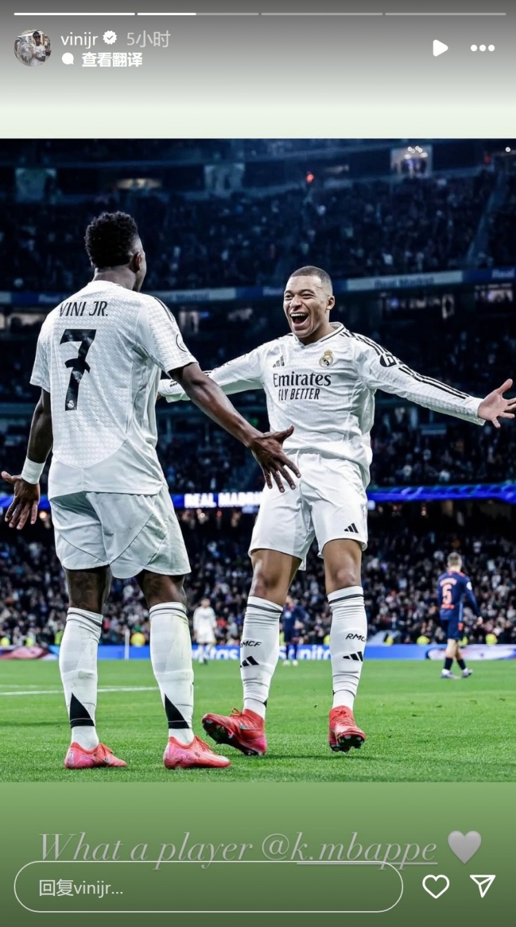 發(fā)布時(shí)間:2025年01月17日 15:28點(diǎn)擊:欄目:足球新聞 1月17日訊 國王杯1/8決賽,維尼修斯和姆巴佩都取得進(jìn)球,皇馬主場加時(shí)賽5-2擊敗塞爾塔,晉級下一輪。賽后維尼修斯在社交媒體上曬出與姆巴佩慶祝的合照,配文:“多么棒的球員,姆巴佩!”姆巴佩轉(zhuǎn)發(fā)維尼修斯的動態(tài),回應(yīng)道:“我們一起加油,天才!” 除特別注明外,本站所有內(nèi)容均為九球直播整理排版,轉(zhuǎn)載請注明出處:維尼修斯社媒曬與姆巴佩合照:多么棒的球員! 本文標(biāo)簽: 足球 西甲 皇家馬德里 姆巴佩