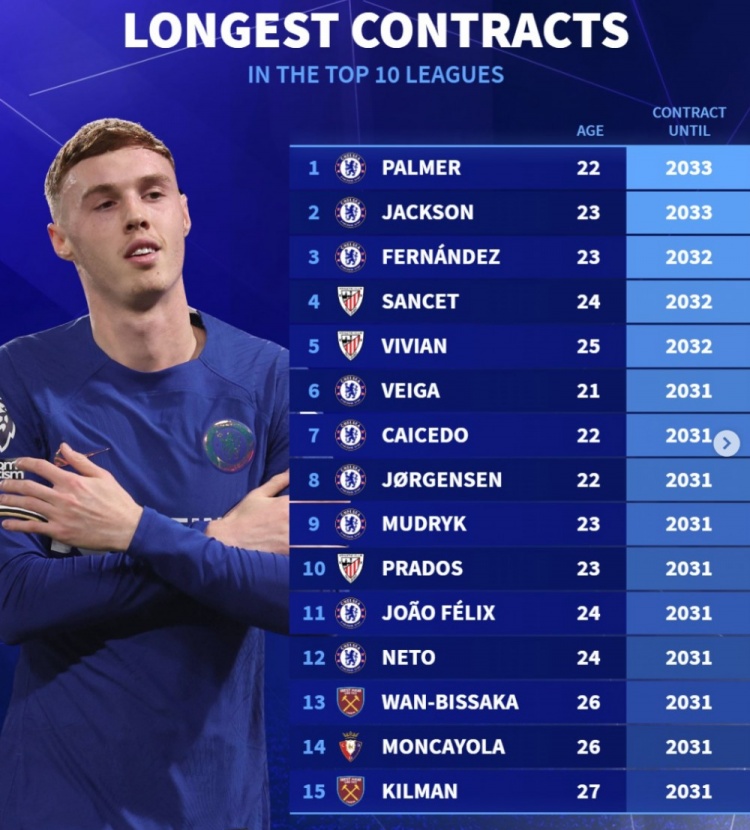 據此前德轉統計,此前切爾西球員帕爾默和杰克遜都與球隊續(xù)約9年,合同期至2033年,他們兩人也位居這份榜單前兩位。若哈蘭德與曼城續(xù)約9年半屬實,這也意味著哈蘭德的這份新合同,將成為前十聯賽最長的球員合同!