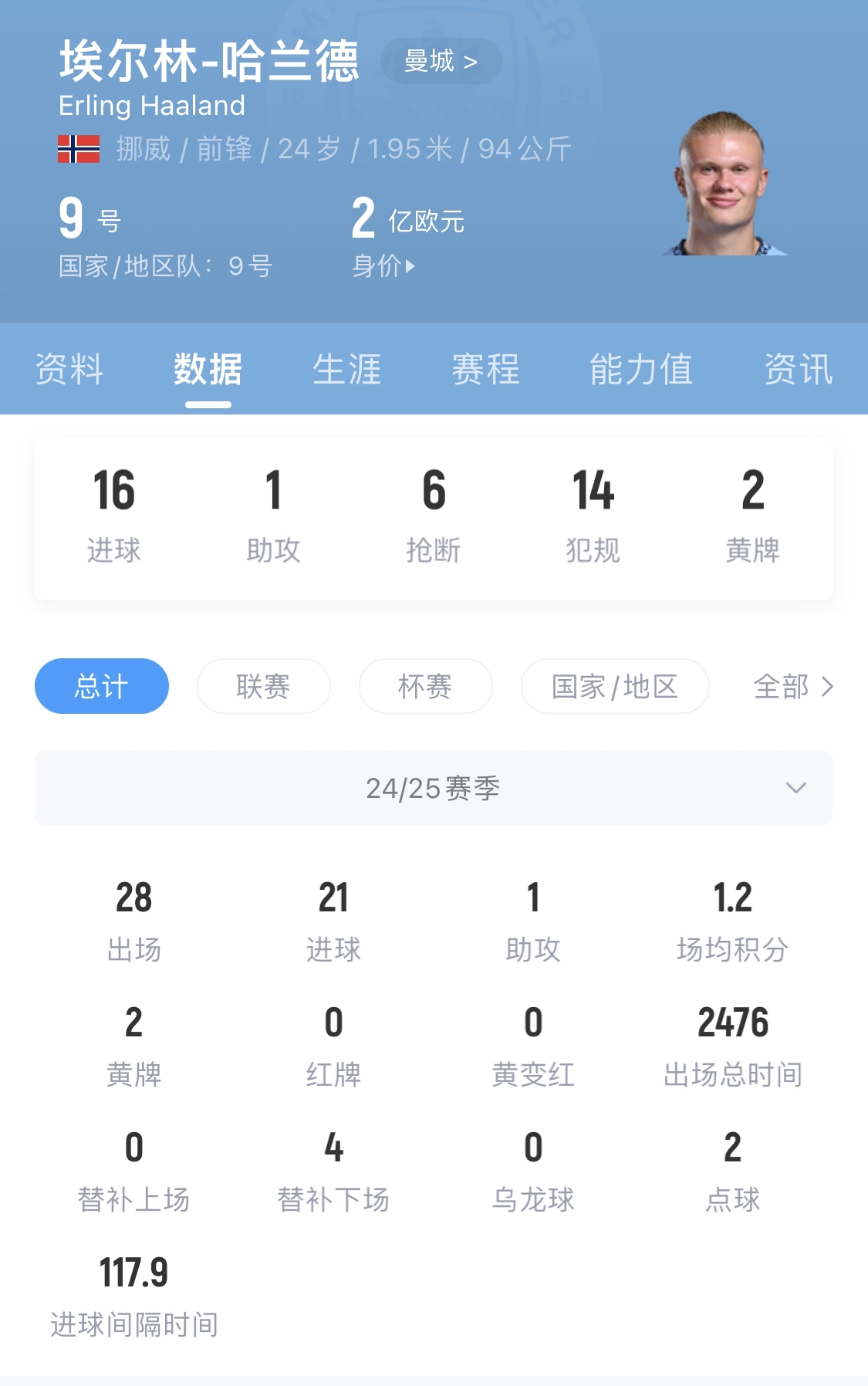 曼城2022年夏天花費(fèi)6000萬歐從多特簽下哈蘭德,截至目前,哈蘭德已經(jīng)在曼城出戰(zhàn)126場(chǎng),貢獻(xiàn)111球和15次助攻。本賽季哈蘭德出場(chǎng)28次,打入21球并有1次助攻。哈蘭德現(xiàn)在德轉(zhuǎn)身價(jià)2億歐。