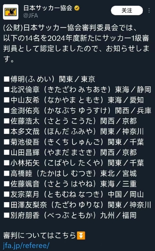 日本足協(xié)今日公布新一期日本足協(xié)一級裁判資格名單,中國裁判傅明在列。