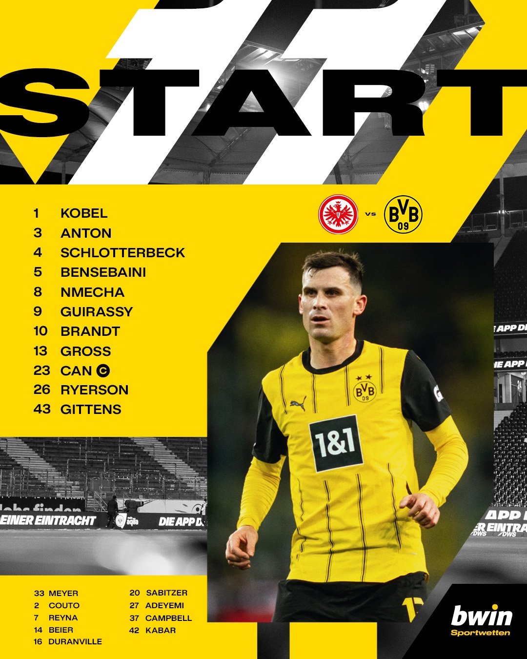 1-科貝爾、3-安東、4-施羅特貝克、5-本塞拜尼、8-恩梅查、9-吉拉西、10-布蘭特、13-格羅斯、23-埃姆雷-詹、26-萊爾森、43-吉騰斯